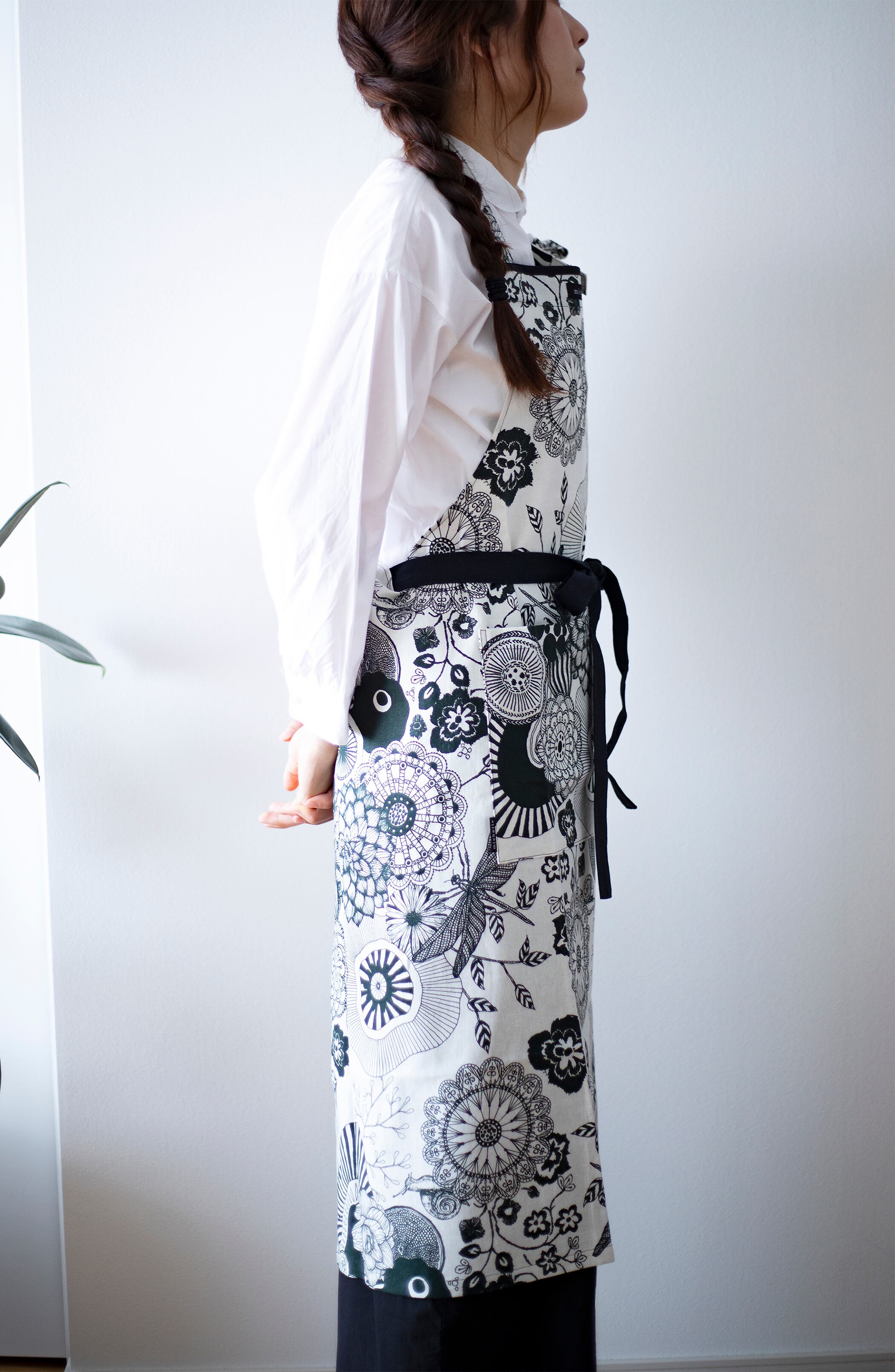 手書きの柄を生地にプリントしエレガントなデザインが特徴のbijouxエプロンは洗練された雰囲気を醸し出します。前ポケットがあり、首紐はお好みに合わせて長さ調節可能です。また、バックのデザインは後ろ姿まで気を抜かない仕上がりになっており、普段使いはもちろん、特別な日のディナーやホームパーティーでも活躍できる一枚です。自分へのご褒美、大切な方への贈り物としてもオススメです!